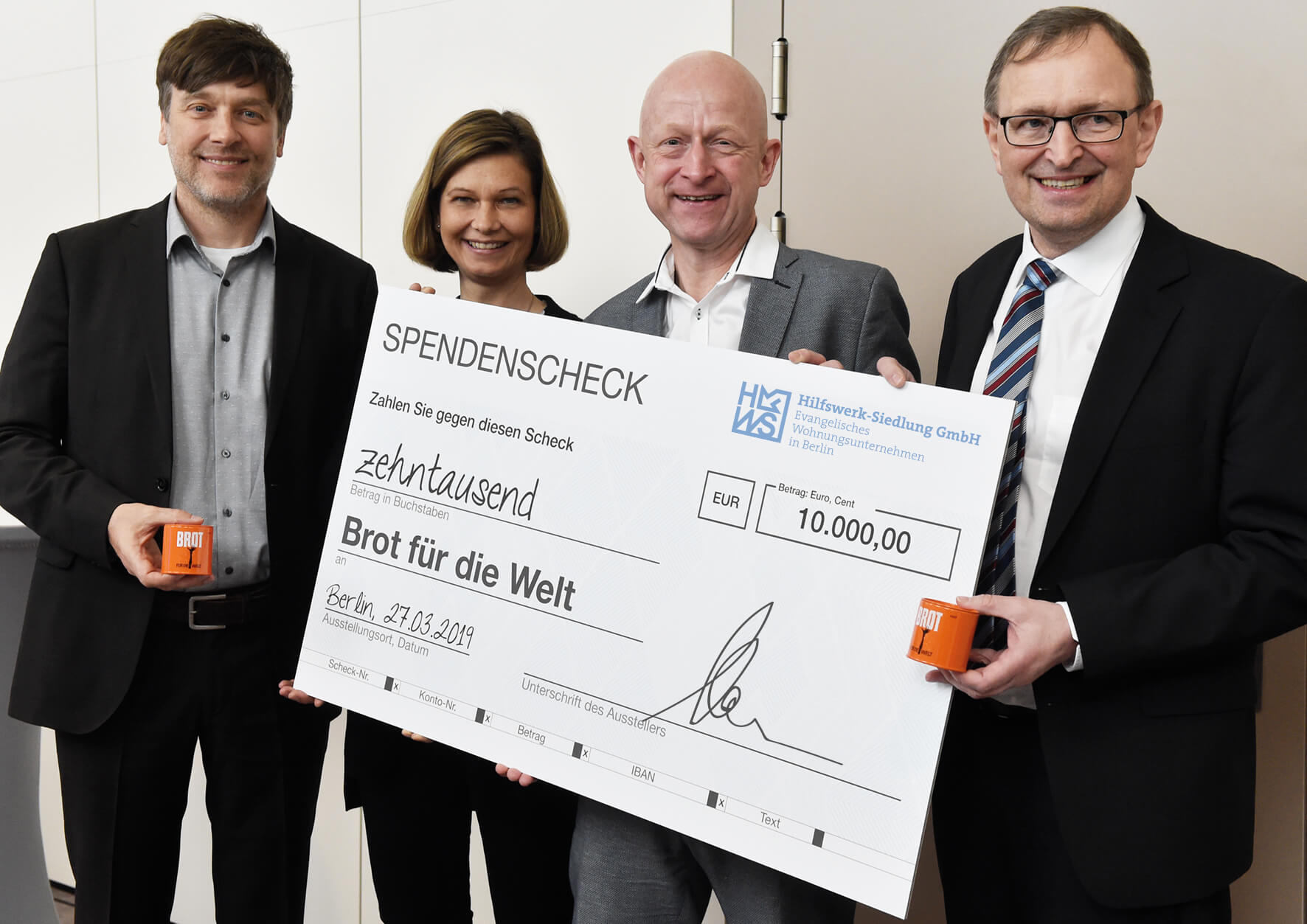 Beim 14. OpenPromos Anwenderforum vom 27.03. bis zum 28.03.2019 in Berlin stellte die Geschäftsführung der Hilfswerk-Siedlung GmbH, Jörn von der Lieth und Dorit Brauns, eine Besonderheit der App vor: Eine digitale Spendenfunktion für die Mieter*innen und Mieter. Zum Start der Spendenfunktion überreichten Jörn von der Lieth und Dorit Brauns einen großzügige Betrag in Höhe von 10.000 € an die Organisation „Brot für die Welt“, die seit Jahren von der HWS unterstützt wird. Die Spendenfunktion ermöglicht den Mieter*innen, zum Beispiel das Guthaben der letzten Betriebskostenabrechnung an „Brot für die Welt“ zu spenden. Eine Spendenquittung wird selbstverständlich ausgestellt.