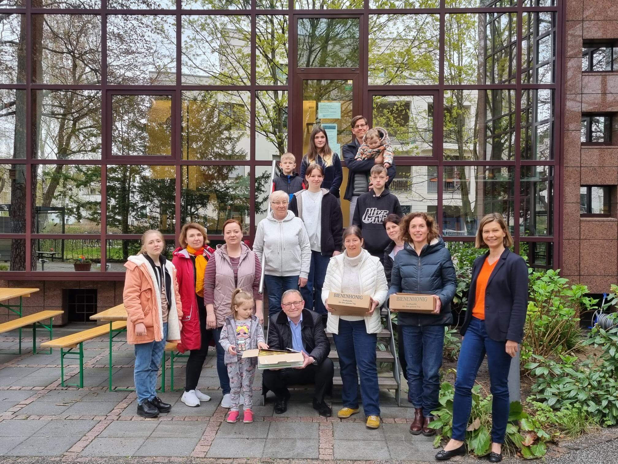 Der Imkerverein Berlin-Zehlendorf e.V. hat Bienenhonig an die ukrainischen Frauen und Kinder, die in einer Wohngemeinschaft in der Geschäftsstelle der Hilfswerk-Siedlung GmbH (HWS) leben, gespendet. Bettina Junkes, erste Vorsitzende des Imkervereins, hat die Honiggläser an die Geflüchteten übergeben.