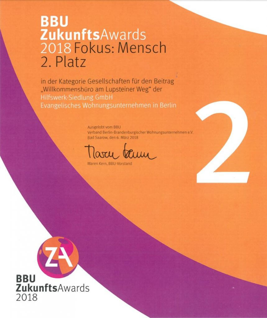 Die Hilfswerk-Siedlung GmbH gewinnt den 2. Platz. Die Hilfswerk-Siedlung GmbH wurde für ihr Engagement mit dem Willkommensbüro am Lupsteiner Weg in Zehlendorf-Süd ausgezeichnet.